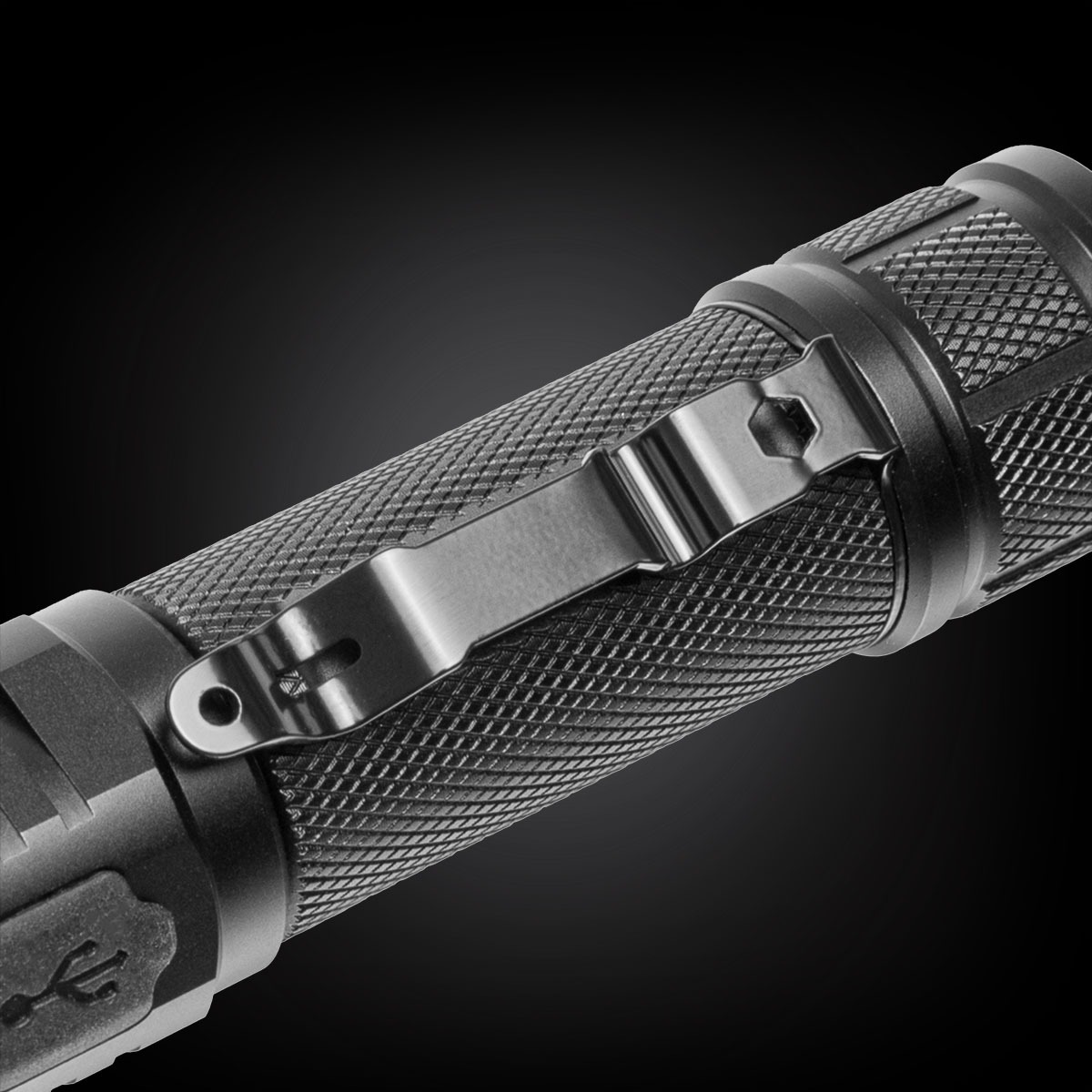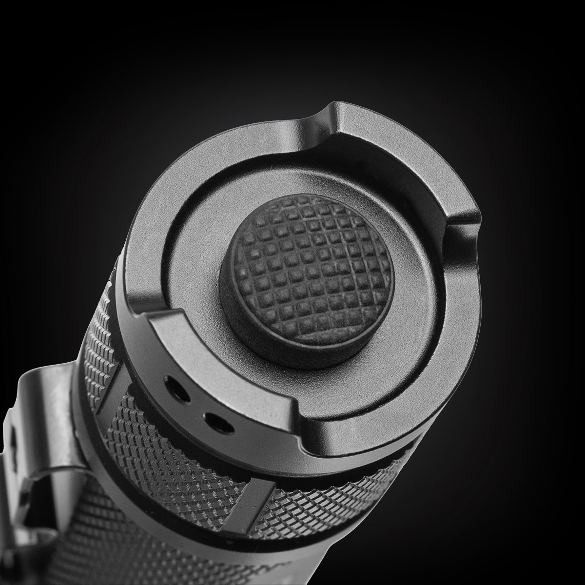 The flashlight has a practical battery level indicator integrated into the mode switch button. The Double-Click feature allows for instant access to high mode, which is extremely useful in situations requiring immediate full illumination. The on/off button is located on the back of the flashlight, while the mode selection button is near the head, allowing for quick and convenient mode switching even in difficult conditions.