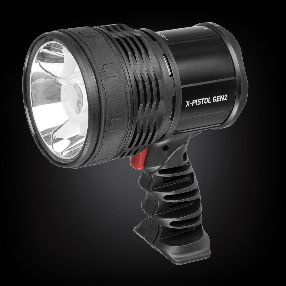 X-Pistol GEN2: szperacz z serii X-Pistol RC, zasięg do 530m, wodoodporny (IPX6), aluminiowy korpus, strumień światła 1500 lm, funkcja Focus, rozkładany chwyt pistoletowy, praca do 10 godzin w trybie migającym.